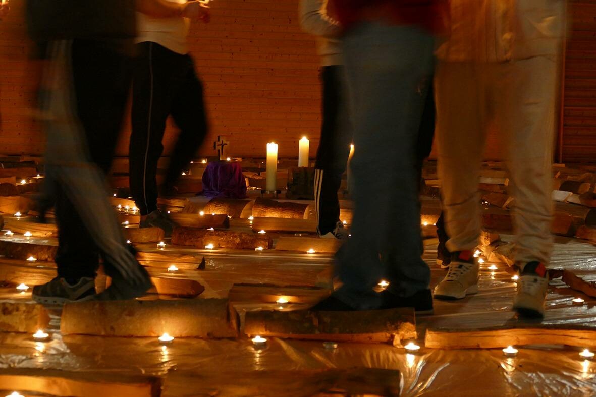 Und dann geht es in die zweite Runde: Nun begehen alle 20 Gefangenen das Bodenlabyrinth gleichzeitig, hintereinander, in kurzen Abständen. Nach jeder Kehre passieren sie dabei parallel die das andere Ende der Schlange auf engem Raum, fast Schulter an Schulter. Es ist eine anspruchsvolle Aufgabe, ein behutsames Gehen auf schmalen Wegen mit den angrenzenden brennenden Teelichtern. Sie müssen aufpassen, gemeinsam im selben Tempo zu bleiben. Symbolisch interpretiert der Gefängnisseelsorger es so: „Wir gehen diesen Weg zusammen als Schicksalsgemeinschaft im Gefängnis. Wir achten auf unseren Vordermann, damit es keine Karambolage gibt." Es gibt keine an diesem Abend.