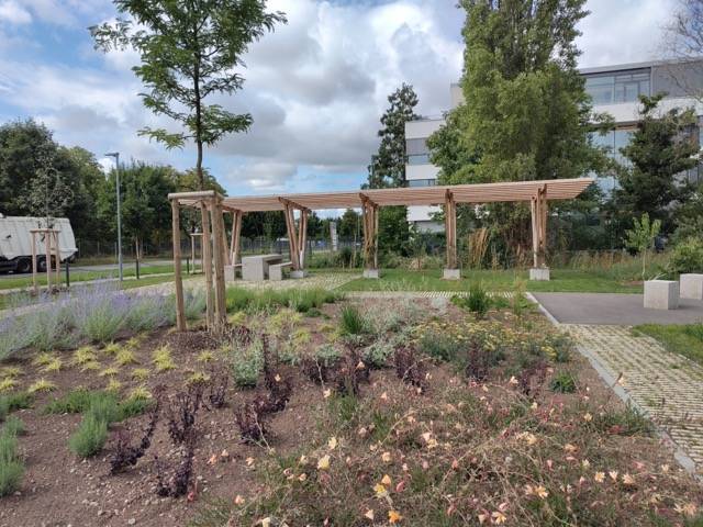 Gewerbe- und Industriegebiete zählen neben den Innenstädten zu den Hotspots des Klimawandels. Durch versiegelte Flächen wie Straßen, Gebäude und Parkplätze heizen sie sich im Sommer stark auf. Oberflächentemperaturen von mehr als 60 Grad sind, schnell erreicht und dann wird es ungemütlich. Im Gewerbepark Breisgau ist mit dem imposanten Klimapavillon an der Max-Immelmann-Allee ein Kontrapunkt gesetzt worden. Mit dem neuen Gebäude und der Außenanlage wird erfahrbar, was Klimaschutz und Klimaanpassung bedeuten. Einerseits eine intelligente Infrastruktur, weg von fossilen Brennstoffen, hin zur Nutzung von Fahrrad, Pedelec und ÖPNV sowie Photovoltaik und erneuerbaren Baustoffen wie Holz. Auf der anderen Seite stehen die Speicherung und Nutzung von Regenwasser, eine kühlende Dach- und Fassadenbegrünung, versickerungsfähige Bodenbeläge, artenreiche Blühwiesen und die Pflanzung trockenheitsverträglicher Baumarten zur Schattenbildung.