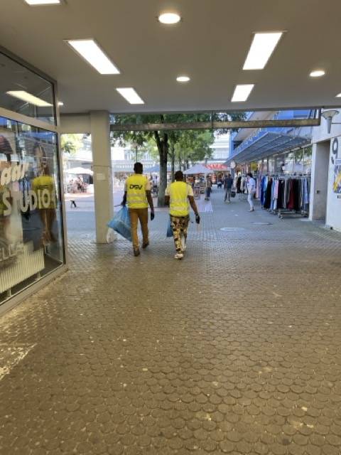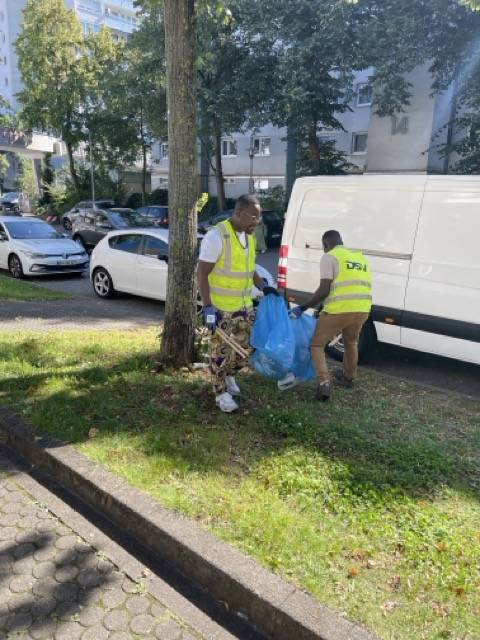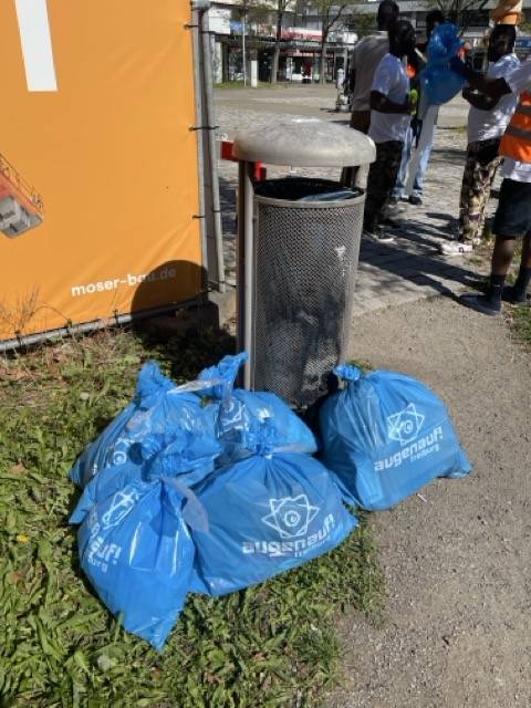 Im Anschluss hieß es: Ärmel hoch! Unter dem Motto „Viele Hände, ein schnelles Ende" machten sich zahlreiche Helfer*innen daran, den Stadtteil von achtlos weggeworfenem Müll zu befreien. Bald wuchs der „blaue Berg" aus vollen Müllsäcken mit der Aufschrift „Augen auf" – ein sichtbares Zeichen für bürgerschaftliches Engagement und die Wirkung gemeinsamer Aktionen.