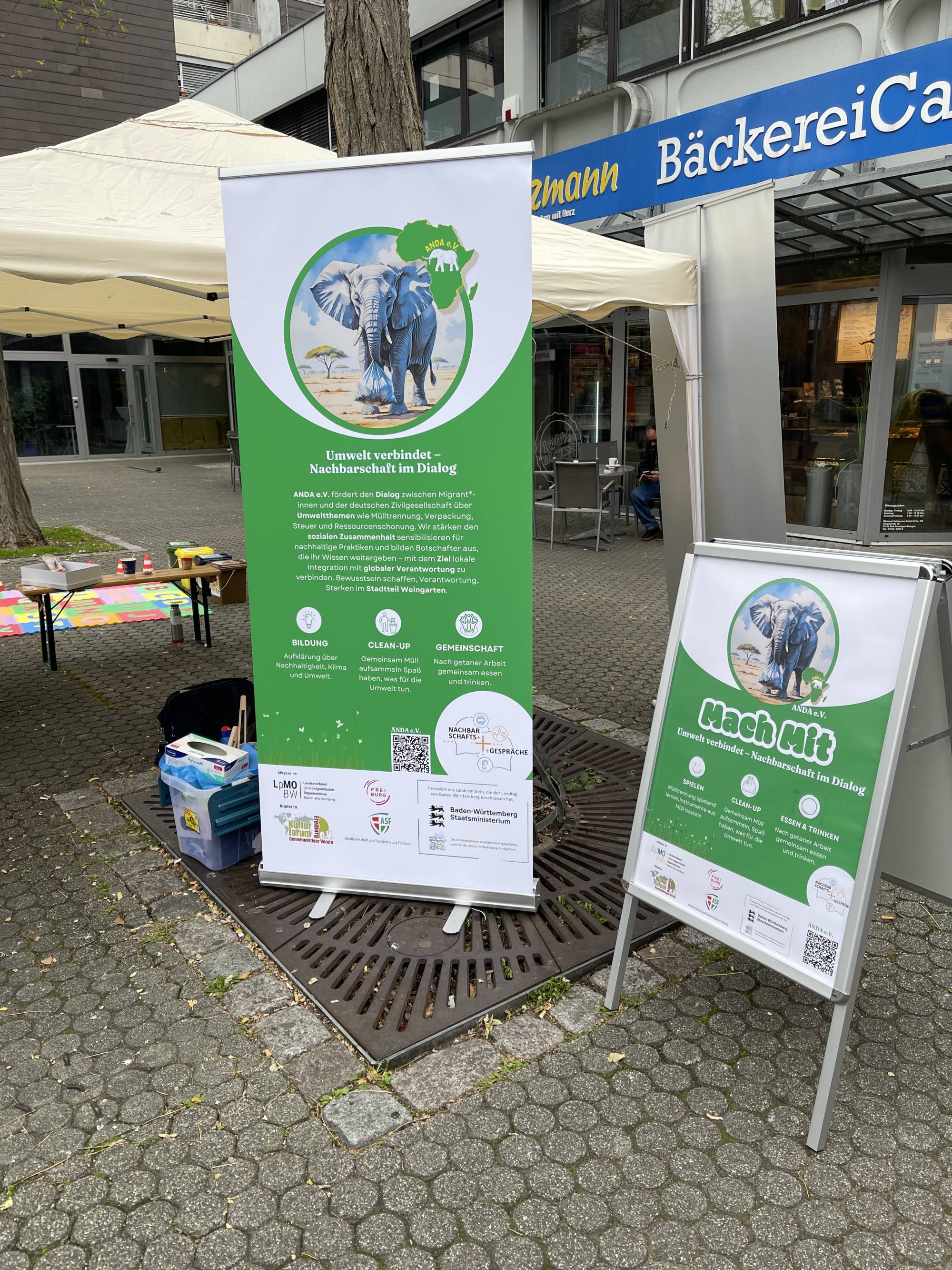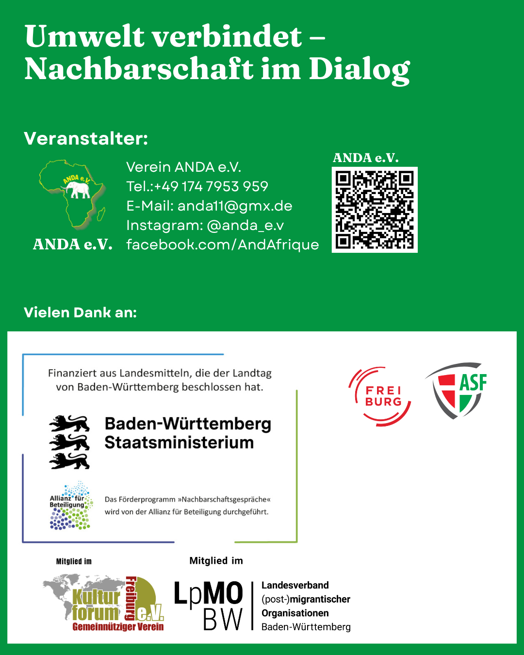 Am 11. Oktober 2025 fand sich der Verein ein zweites Mal auf dem Fritz-Schieler-Platz in Freiburg-Weingarten ein und bot Umweltbildung mit Spiel und Spaß. Der Verein ANDA e.V. präsentierte dort im Rahmen des Wochenmarktes sein Projekt „Umwelt verbindet – Nachbarschaft im Dialog". Nachhaltiges Engagement vor Ort, ein Bildungsangebot mit Austausch auf Augenhöhe, eine gelungene Putzete und dann ein gemeinsames Fest mit leckeren Köstlichkeiten aus Togo und einem schönen Rahmenprogramm.