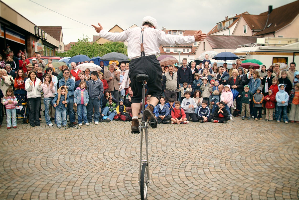 Doch ob Feuer Artistik, Jonglage oder Hochrad Turbulenzen, Clown Klikusch wird mit allem auf seine ganz eigene Art fertig.