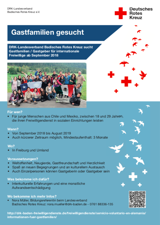 Das Badische Rote Kreuz sucht dringend Gastfamilien/ Gastgeber_innen, die von September 2018 an Freiwillige aus Lateinamerika für ein Jahr (bzw. mindestens drei Monate) bei sich aufnehmen möchten. Die 30 jungen Menschen aus Mexiko und Chile werden über das weltwärts-Programm ihren einjährigen Freiwilligendienst in sozialen Einrichtungen in Freiburg und Umgebung leisten. Sie sind zwischen 18 und 29 Jahren alt und studieren bzw. arbeiten momentan in ihren Heimatländern.